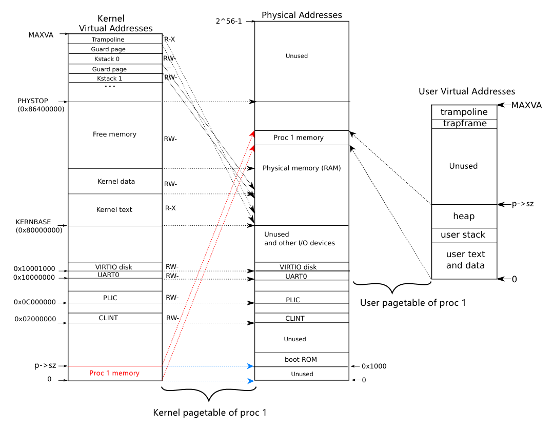 在内核空间运行时中启用的是内核页表,但在内核页表中虚拟地址基本都是直接映射到物理地址的,所以用户的虚拟地址会被映射到错误的地方,如下图左半部分蓝色箭头所示。我们的目标就是修改进程的内核页表,让这一部分虚拟地址映射到正确的位置。